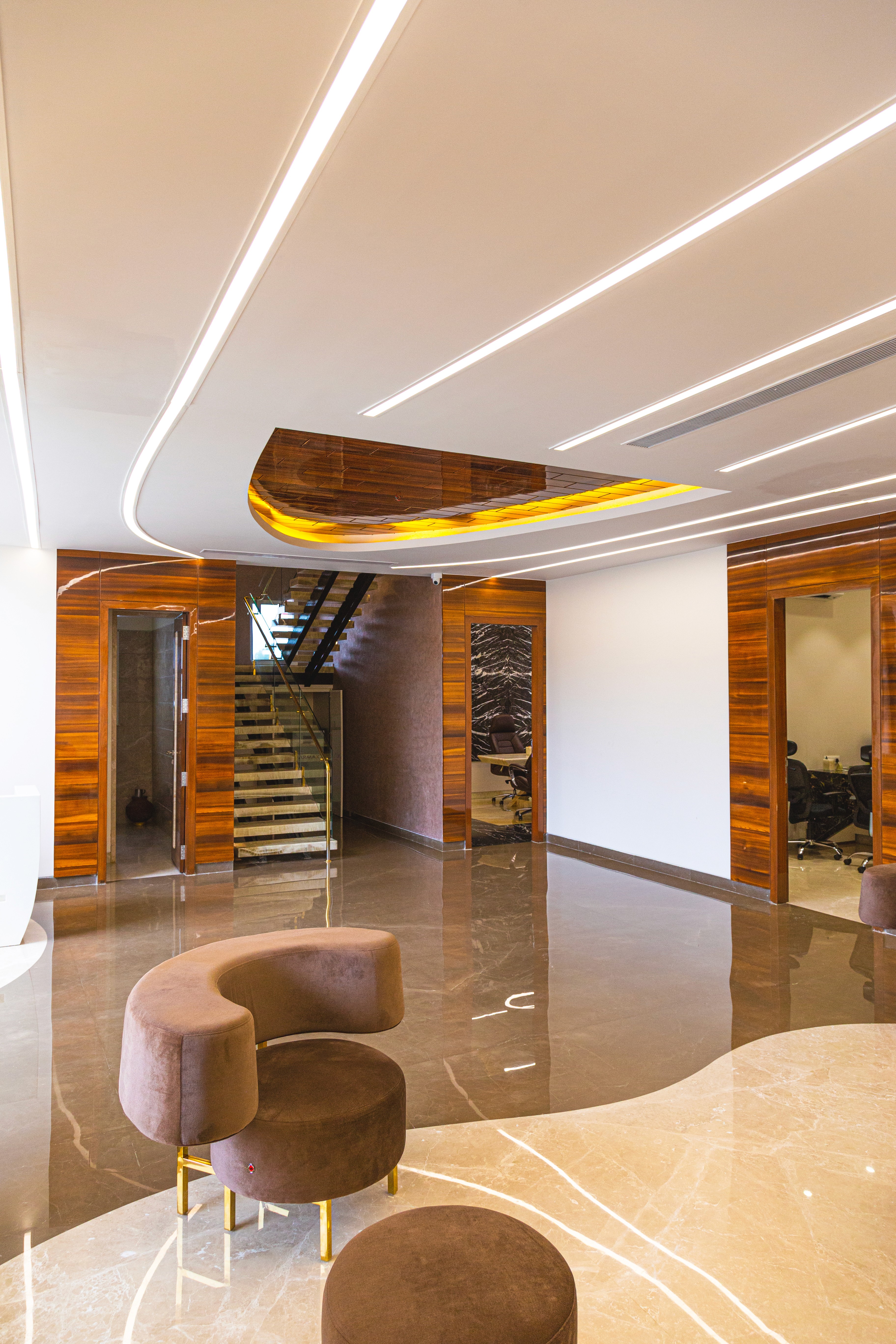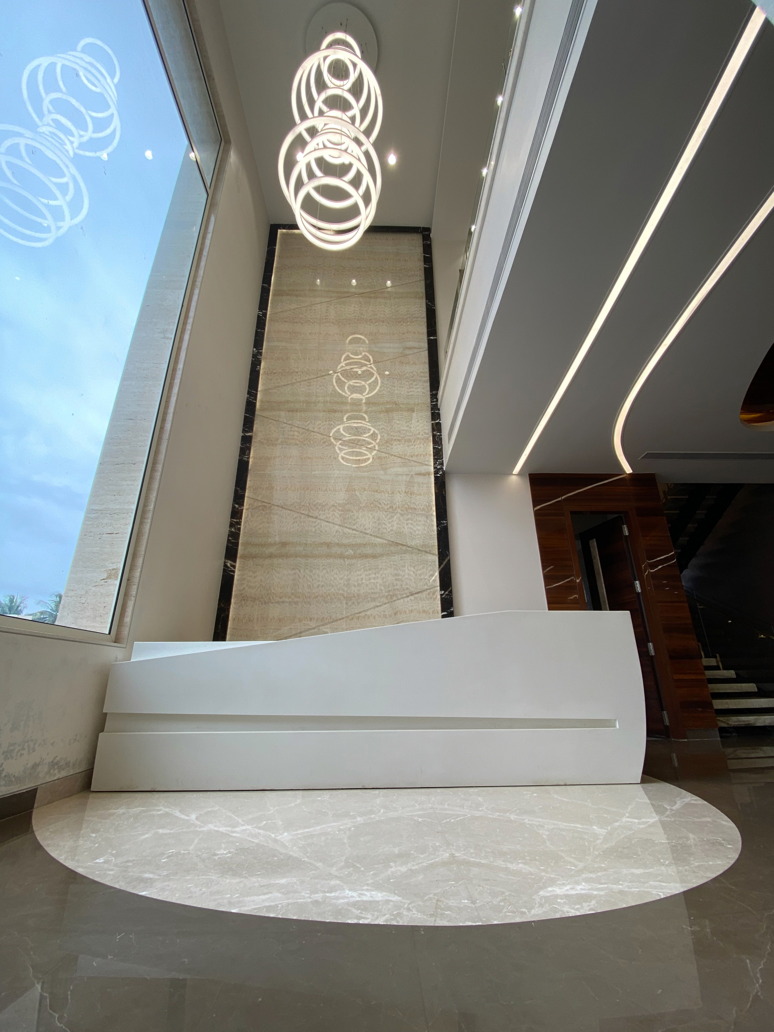 Step inside, and you're greeted by a lavish lobby, reception, and waiting area, meticulously crafted to immerse clients in the world of exquisite marble. The fluidic design throughout the interior ensures a seamless flow between spaces, with each area subtly spilling into the next, fostering an experience that is both elegant and inviting.