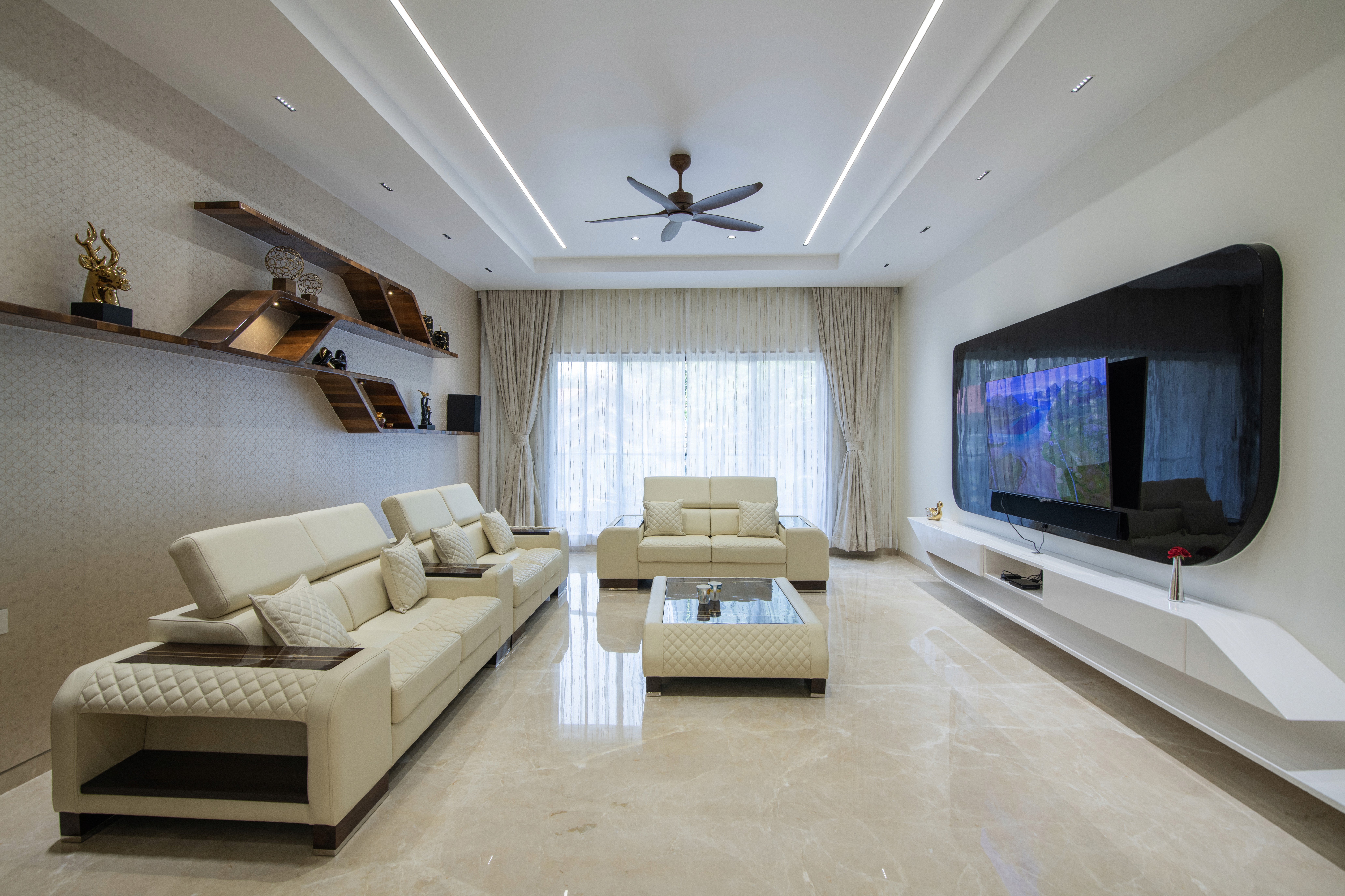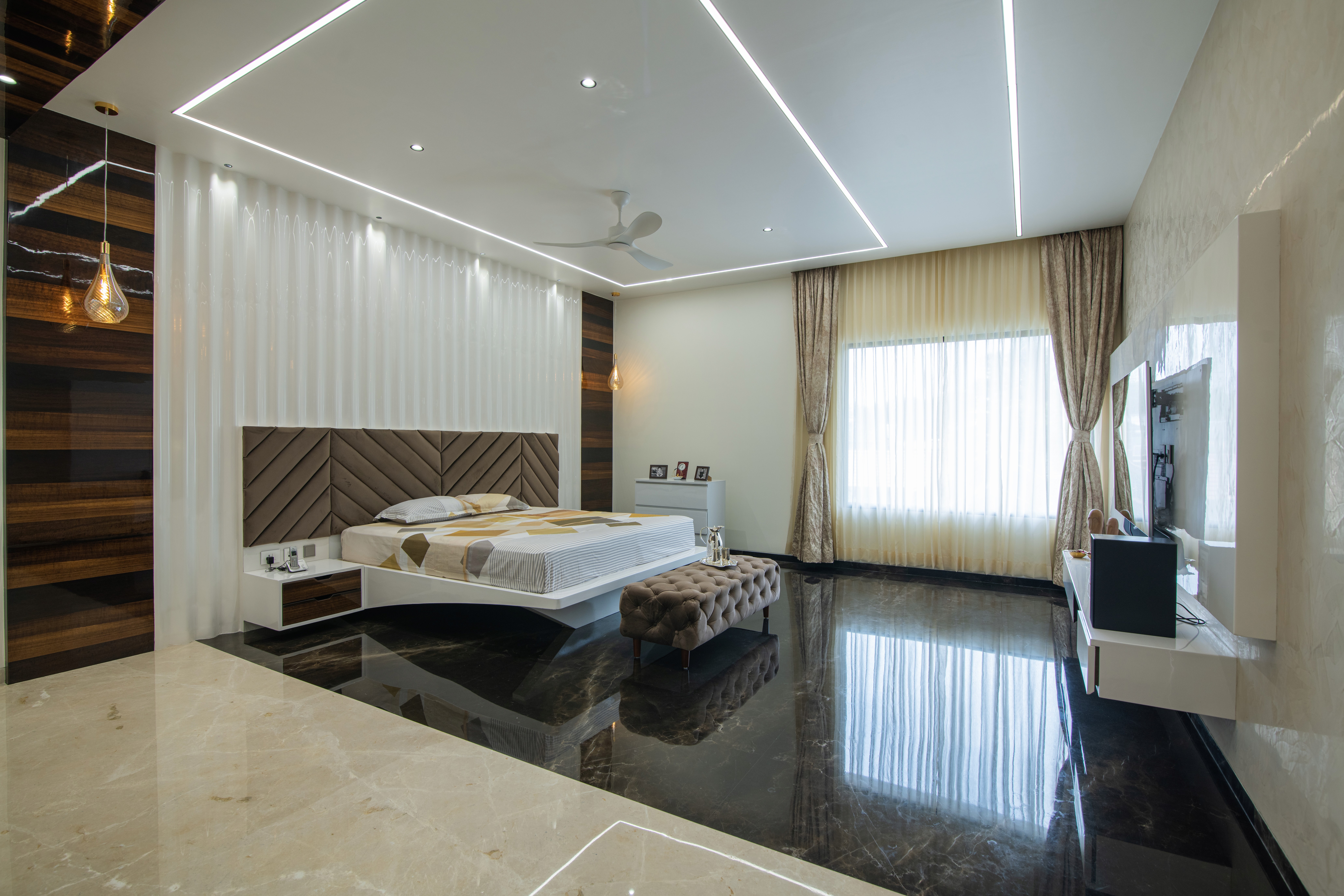 The exterior of the house has a strong identity enabled by the sensuous marble cladding that is punctured by a large window. This forms a strong co-relation between the experience of the outside and the inside of the residence.