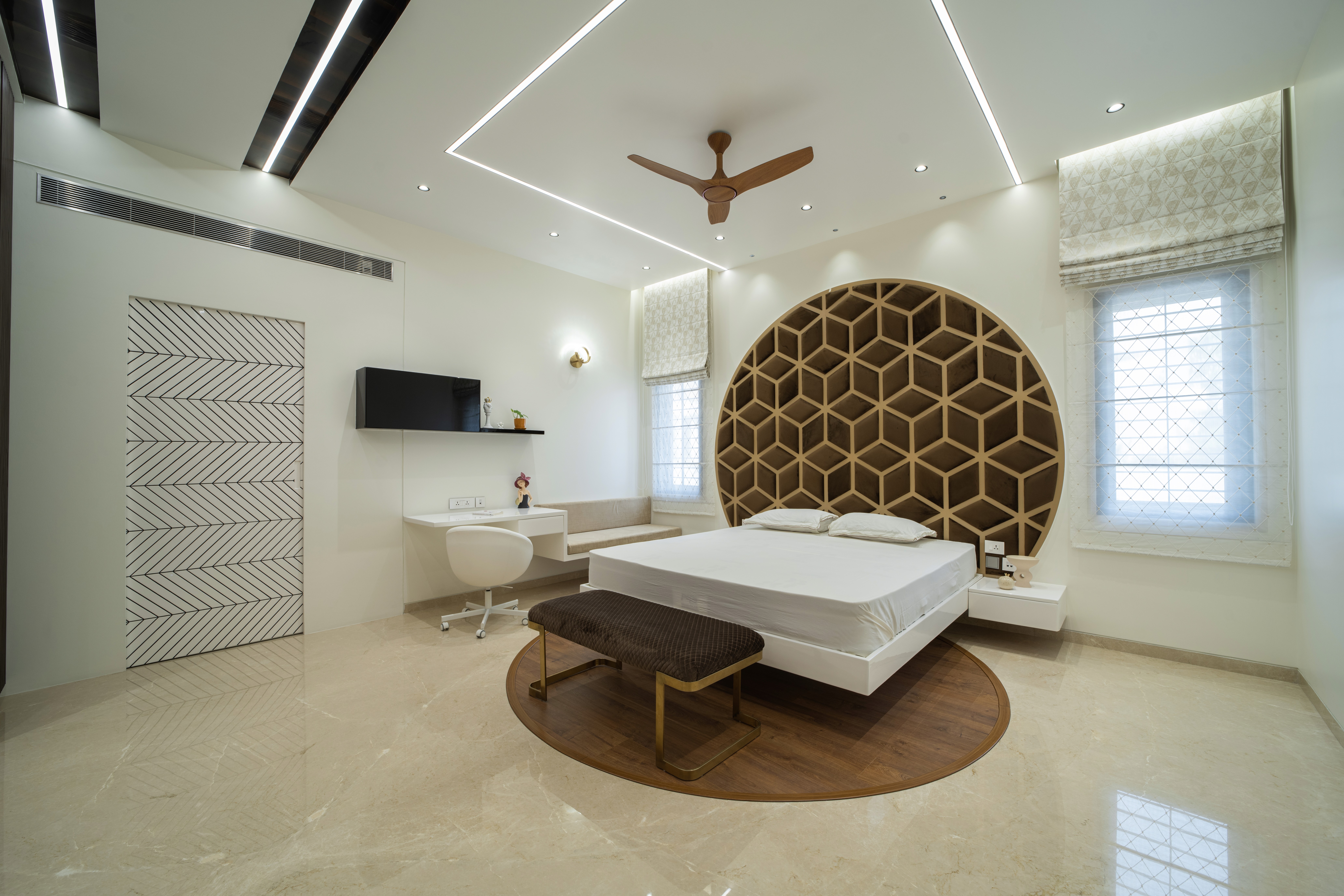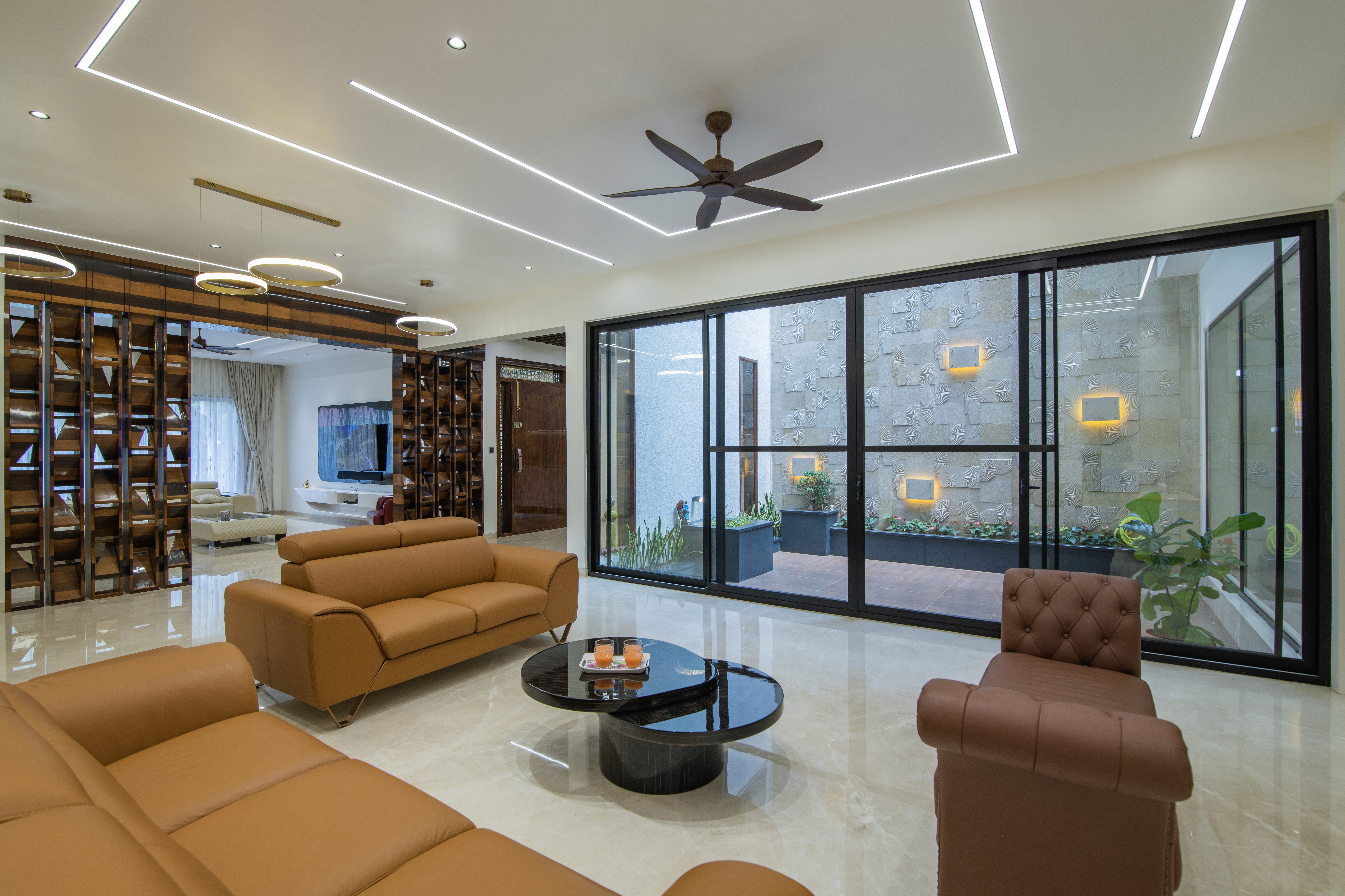 Public spaces of the house such as the family, living and the kitchen loin the courtyard. While the kitchen is visually connected the family space physically spills into the courtyard across the sliding folding fenestration. The courtyard is detailed with vertical retractable roof in a way to enable ventilation into it without compromising on privacy from the neighbors. With the courtyard being the protagonist of the house, the rest of the house is rendered with a mute palette comprising of stucco finishes, wood and Italian marble.