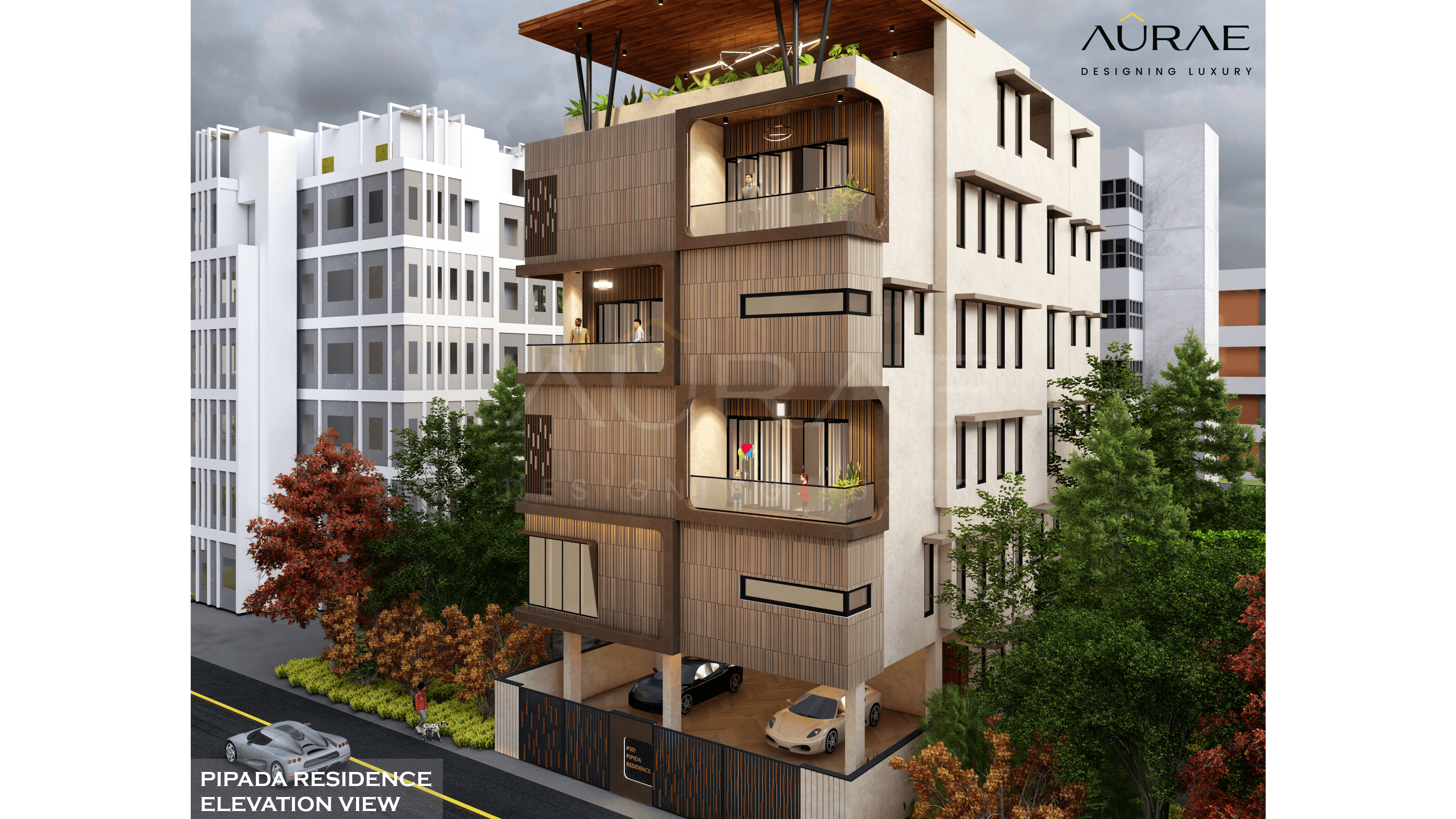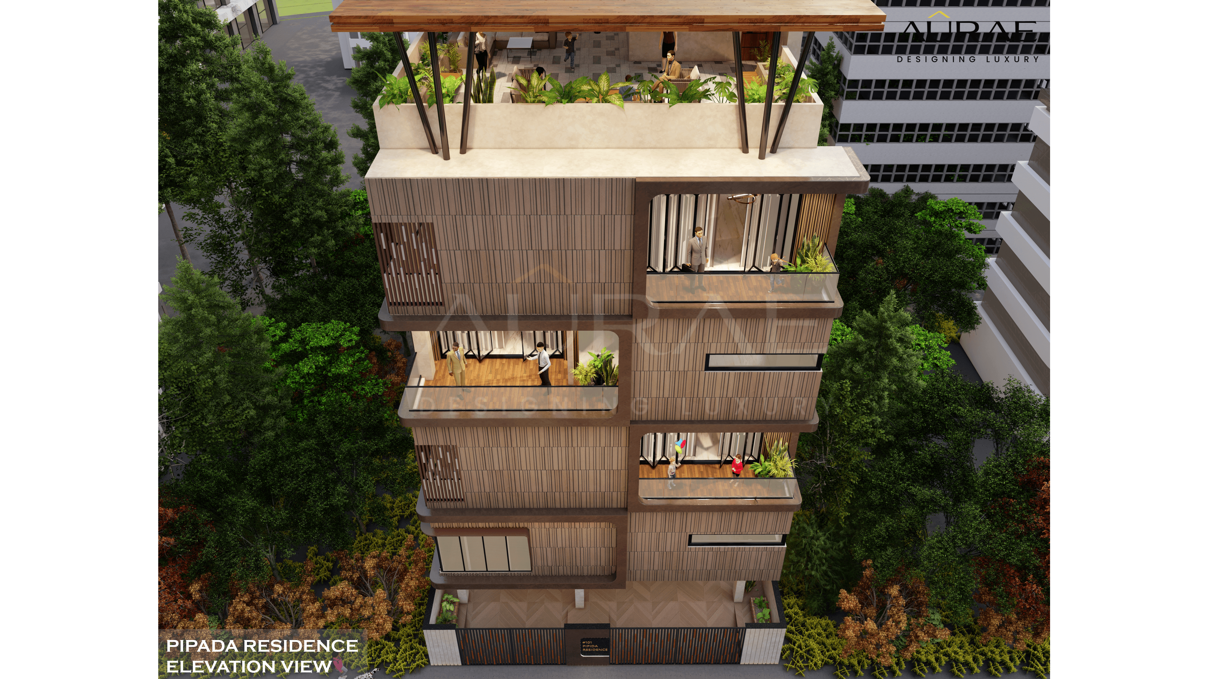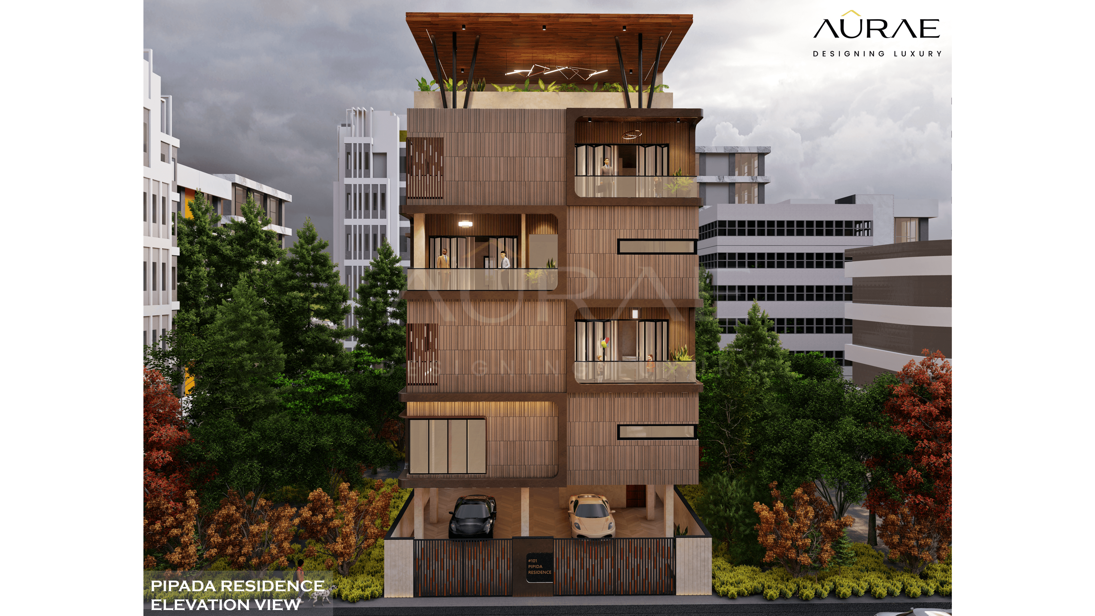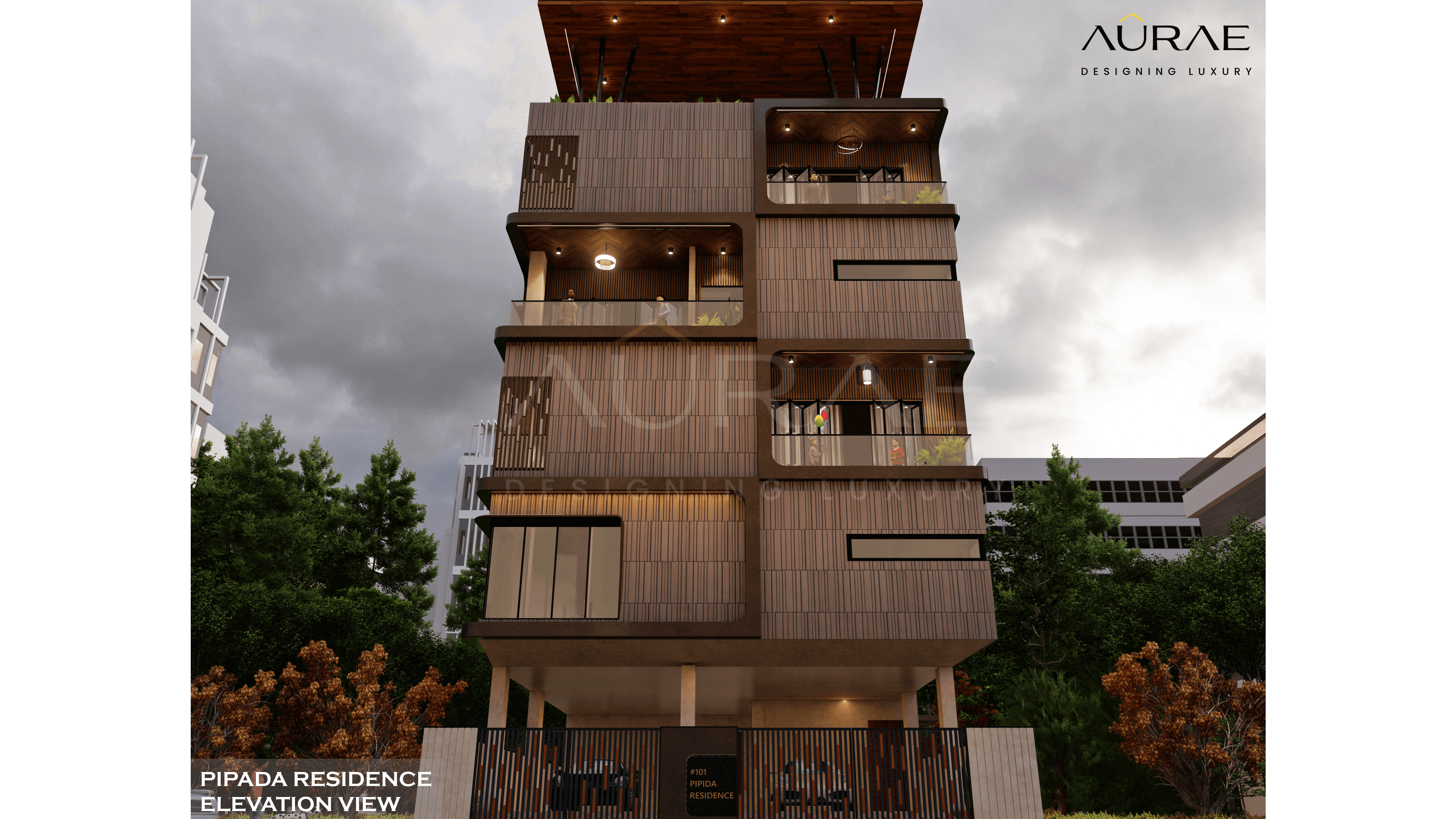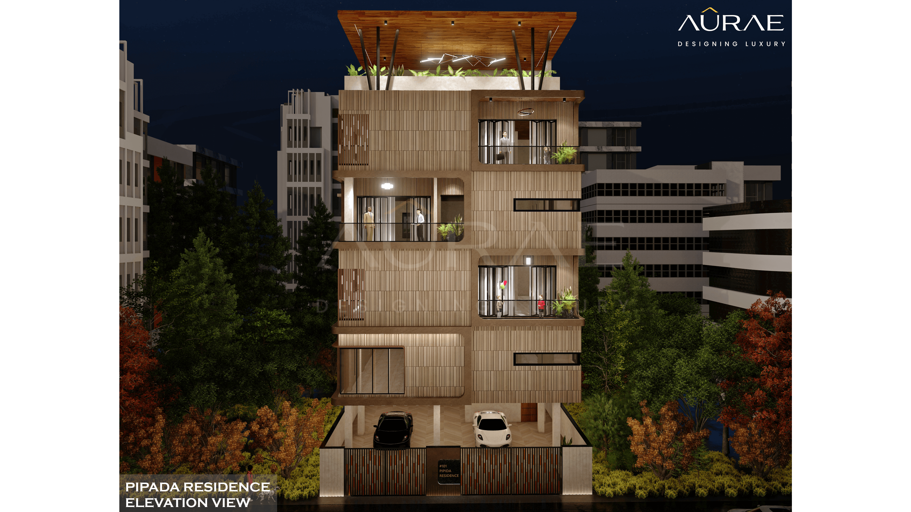 Each floor unfolds with thoughtful precision, offering generous balconies that invite nature in. The rooftop garden, crowned with a sculptural pergola, becomes a sanctuary of serenity and indulgence. The elevation is both bold and graceful — a visual symphony of proportion, rhythm, and materiality.